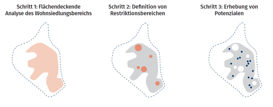 Im Rahmen des Konzeptes wurde zunächst eine Bestandsaufnahme der Siedlungsstrukturen durchgeführt. Neben verschiedenen Stadtraumtypen wurde der Siedlungsraum mit verschiedenen Restriktionsbereichen gekennzeichnet, die für eine Innenentwicklung ausgeschlossen werden. Die übrigen Flächen wurden genauer untersucht und Potenzialflächen definiert. Folgende Potenzialflächentypen werden unterschieden: