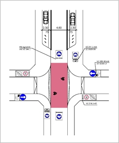 Die Fahrbahndecke soll sich in einem guten Zustand befinden und auch bei schlechten Wetterverhältnissen gute Bremseigenschaften aufweisen. Die Fahrbahn ist durch einen durchgezogenen Breitstrich abzugrenzen. Die Fahrbahn soll in der Regel eine Breite von 4,60 m (inkl. Breitstrichmarkierung) aufweisen. Damit sind Begegnungsfälle von jeweils zwei Rad Fahrenden pro Fahrtrichtung, selbst wenn diese mit Spezialfahrrädern unterwegs sind, möglich. Ebenso sind Begegnungsfälle zwischen einem Kfz und zwei Rad Fahrenden möglich, sofern die Fahrradstraße für den Kfz-Verkehr freigegeben ist (s. Anhang 1a und 1b). Die Mindestbreite einer Fahrradstraße liegt bei 4,00 m (inkl. Breitstrichmarkierung), um ausreichend Fläche für den Begegnungsfall eines Kfz und eines Rad Fahrenden zu gewährleisten. Im Streckenverlauf ist das Fahrradpiktogramm (Zeichen 244.1 "Beginn einer Fahrradstraße“) in regelmäßigen Abständen zu wiederholen. Gefahrenstellen, z. B. enge Kurven, sind flächig rot zu markieren. Die Fahrradstraße ist, unter Berücksichtigung der Naturschutzbelange, bedarfsgerecht auszuleuchten.